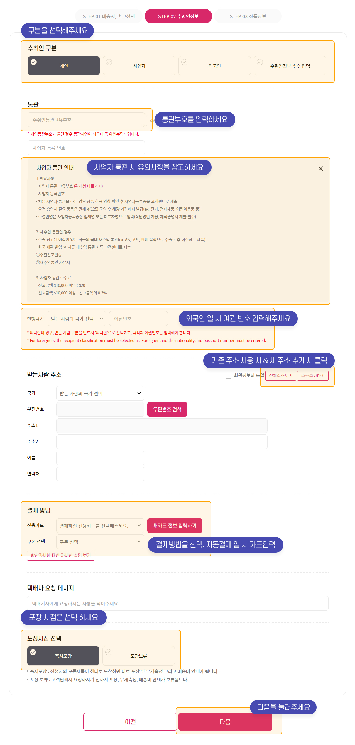 3. 수취인 정보, 결제방법 그리고 포장시점를 입력해주세요.