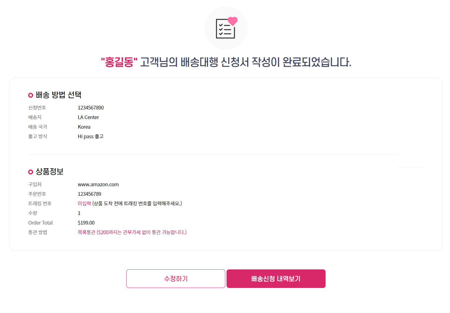 5. 배송대행 신청 완료 내용 확인하세요.